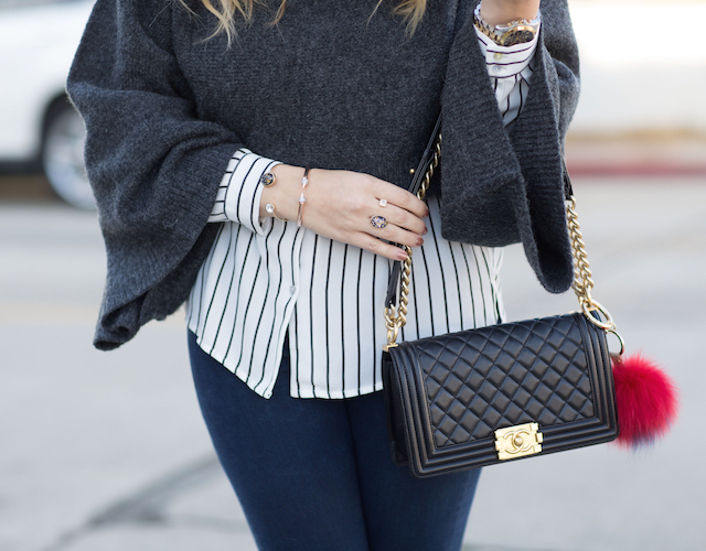 내부에 두 개의 수납 공간이 있고 세로로 길어진 디자인인데요. 이 모델은 색상도 은은한 라이트 그레이로 골드 체인 및 장식과 굉장히 잘 어울리네요.