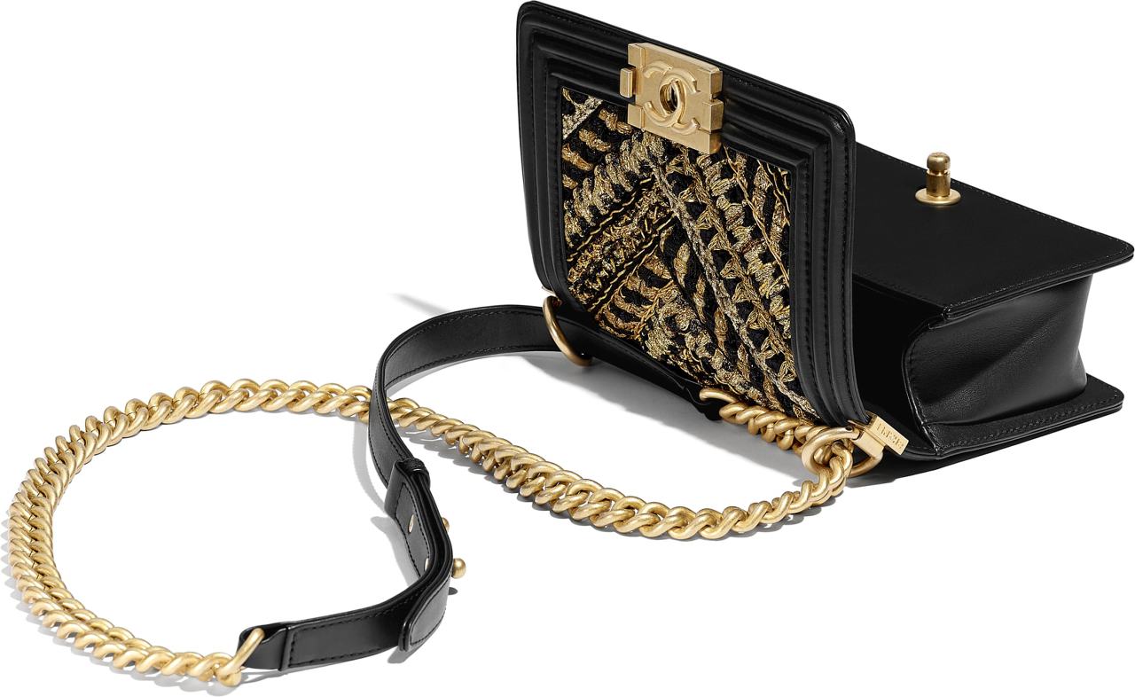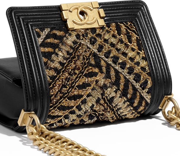 블랙과 골드 조합이 화려한 분위기를 만들어내고 샤넬 보이백 금장의 변형된 느낌이 드네요.