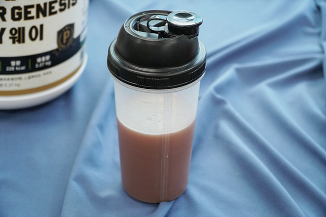 물에 넣은 단백질파우더 모습이에요. 파우더를 이렇게 사진 상으로 확인해도 곱게 만들어져 있다는게 보이는데요. 파우더가 고운게 중요한 까닭은 물을 뜨거운걸 쓰지 못하고 차갑게 해서 타야되기 때문입니다. 차가운물에 파우더를 그대로 넣고 그냥 쌩으로 섞어마셔야 하니 가루가 무조건 잘 녹아야겠죠?