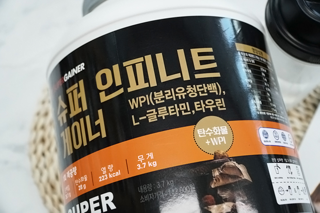 슈퍼인피니트게이너 사진으로 봤을때도 커보이지만 실제로도 꽤 커요 용량만 거의 4키로 가까이 나오구여 하루 한컵만 먹으면 두달이상은 먹는 양입니다. 굉장히 많다고 보시면 돼요ㅋㅋ 다행인건 먹을수 있는 기간이 무지 길어요. 가루로 만들어져 있는거라서 잘 상하지도 않고 오랫동안 먹을 수도 있다고 합니다.