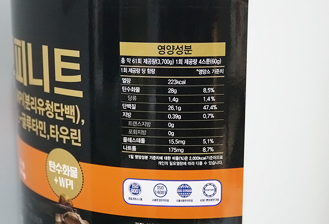 게이너 보충제는 두 성분이 모두 풍부하게 들어있지만, 첨가한 비율에 따라서 함유량이 천차만별로 다르게 나오기 때문에 함유량을 꼭 보고 사라고 하더라고여 그래서 슈퍼인피니트게이너 살때도 단백질 탄수화물 함량 다 봤지요ㅋㅋ 단백질이 26.1 / 탄수화물은 28 입니다. 이게 한 컵에 해당하는 분말의 양을 기준으로 한 함유량입니다.