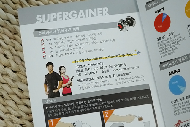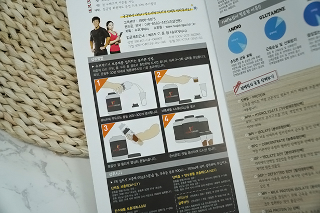 살찌는 보충제를 시키면 전단지도 같이 딸려와요. 전단지 내용은 먹는법 소개하고 단백질 정보도 있고 저거 오른쪽꺼 펼쳐보면 수많은 보충제들이 쭉 나열되어 있습니다. 빼먹고 안찍었네요ㅋㅋ 어차피 보충제 종류 소개들이라서 걍 홈페이지에도 나와있는 사항들이고여 먹는 사람이 봐야될 부분은 왼쪽의 먹는법! 권장하는 분말양도 나와있고 언제 먹는게 좋은 건지도 나와있고여